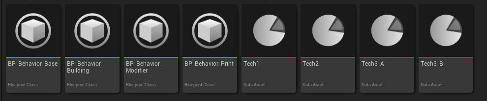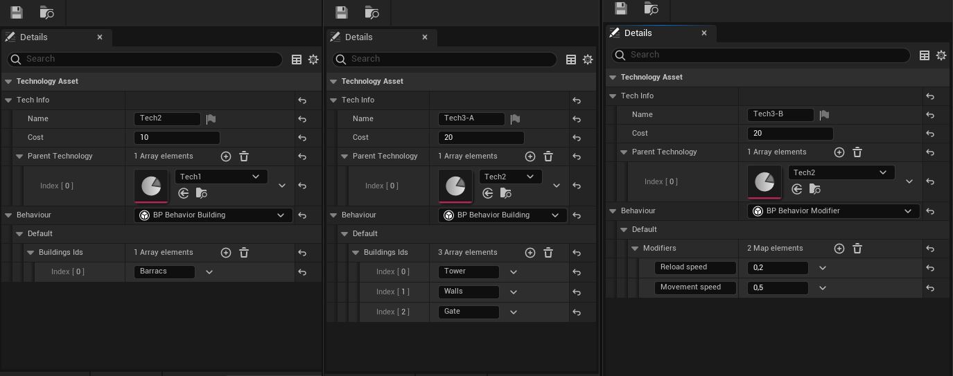 It first calls Activate function on obtained behavior and then it just adds the technology into its own array (so UI knows it can’t be activated again). In the end it calls OnTechnologyActivated delegate. As we can see all logic is passed to the created behaviors. This way it is highly scalable and expandable with another behaviors. Do we need to research another building? Simply add another Technology data asset. New modifier? Again create new asset. Do we need something completely different? Just create a new behavior with correct parameters and it can be reused with all different types of relevant data.