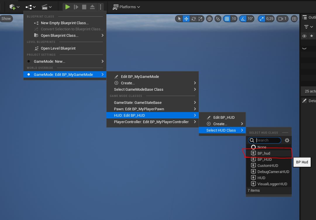 Now lets set this HUD to be used by our game mode. Don’t mind the other classes I have in my game mode. They are not needed. Just select the class you just created.