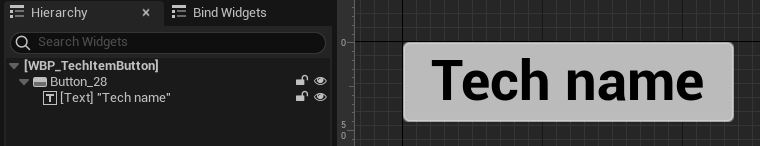Create a new User Widget subclass in blueprint called WBP_TechItemButton which will represents one technology. Now add a button and text inside. Don’t forget to check IsVariable on the Text widget in the upper right corner.