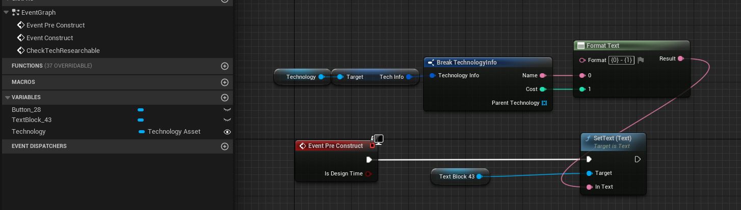 Add the TechnologyAsset variable so the widget knows which technology it represents and add some logic in the PreConstruct method so we can see changes in the editor. Don’t forget to mark the variable as public. We are just setting the text to show the name and cost.