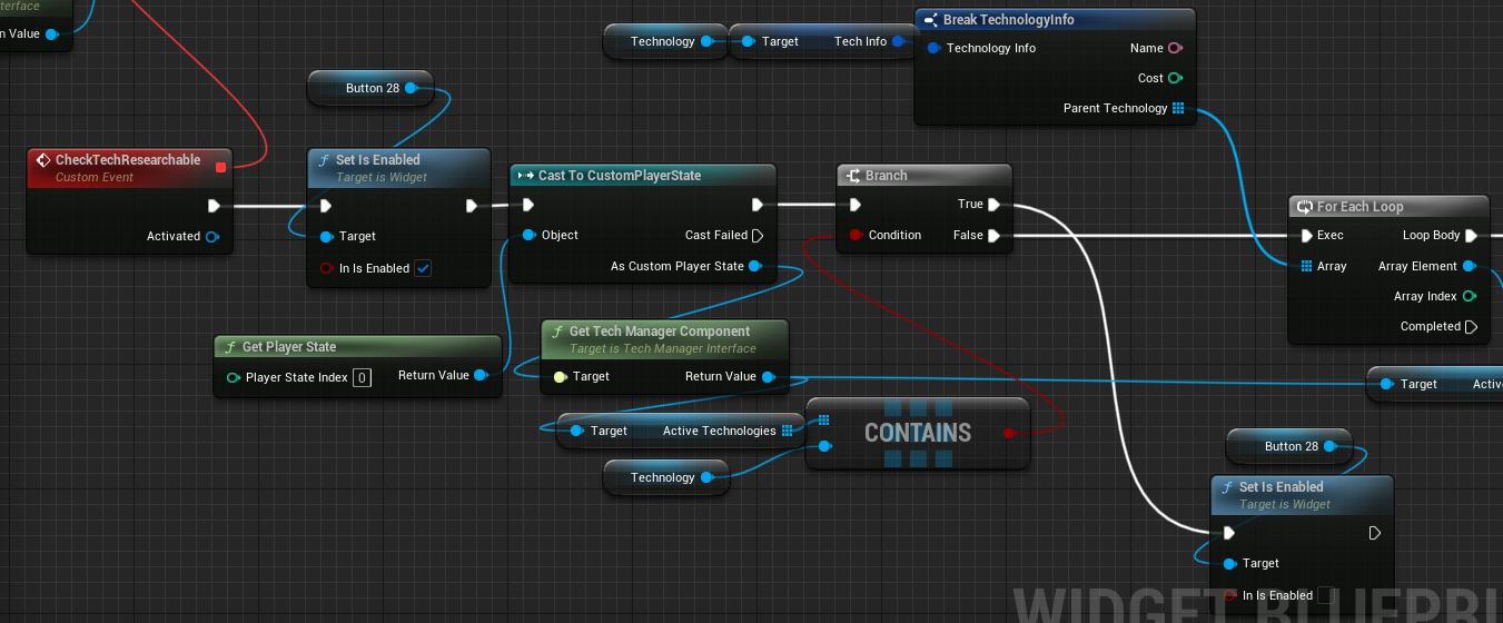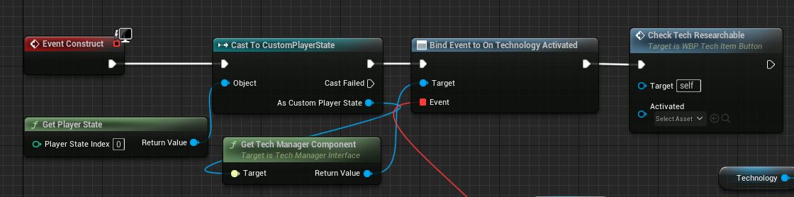 Next we need to define the unlocking logic itself. We need our button to be enabled only when the technology can be activated. We write this in the Construct method. We obtain the TechManager which I have saved on the player state. Bind custom event to “OnTechnologyActivated” delegate and then manually call the function which we just bind.