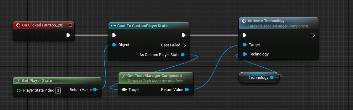 And finally we create a event to call when the button itself is clicked on. We simply get TechManager reference and call ActivateTechnology function.