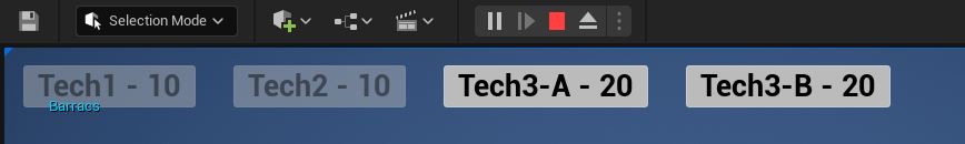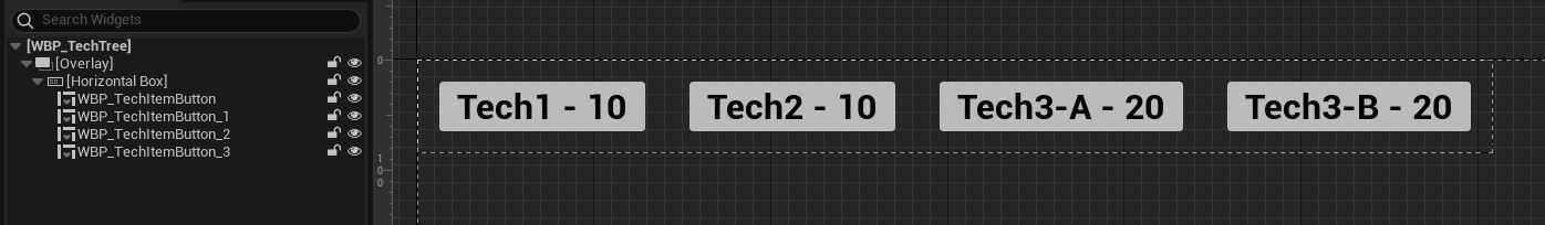 Create a new User Widget blueprint called WBP_TechTree and add an overlay to it. Next add 4 WBP_TechButtons (we have only 4 technologies) inside an horizontal box and add some padding so we have some nice spacing present. Assign each button a technology and compile and we will see a change in appearance because we used the PreConstruct method.