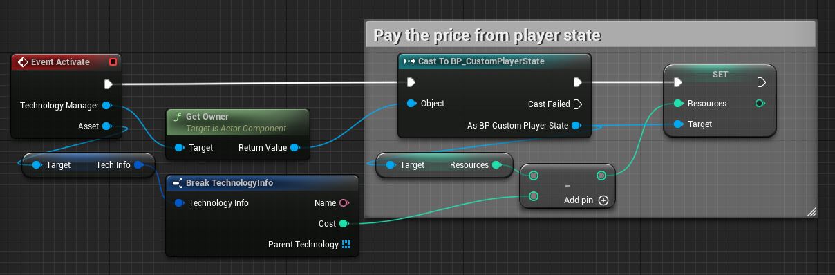 Because we will have multiple behavior which will share some common logic (spending resources in order to activate them) we want to contain this logic in a base class. We will add the spending resources logic into the BP_Behavior_Base class and let other logic for our child classes we will create in a minute. I have my resources saved on player state.